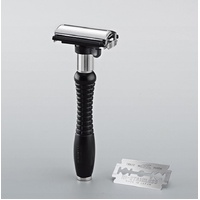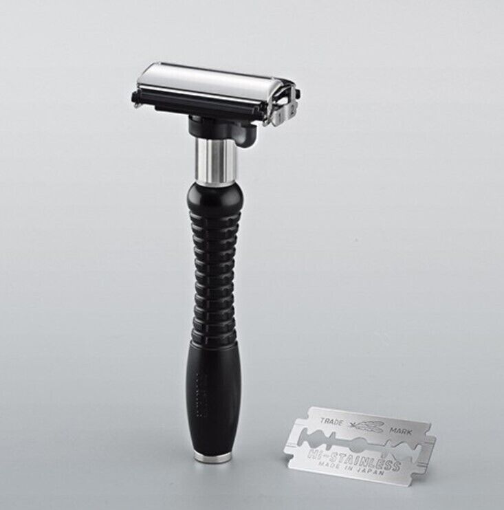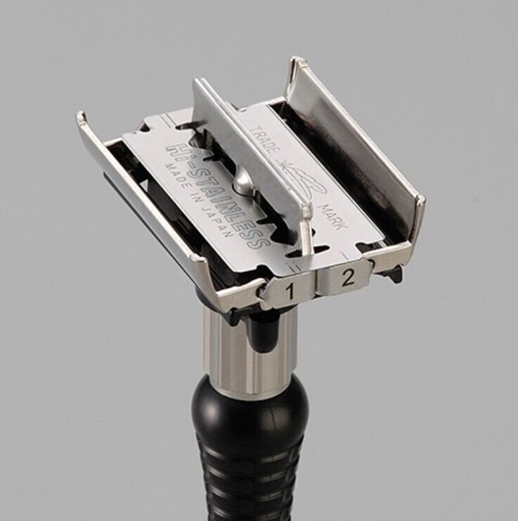 This razor works best with Feather Double Edge Blades. The Feather Adjustable Double Edge Razor comes with 2 Feather Double Edge Blades. The razor handle and blades are made in Japan.