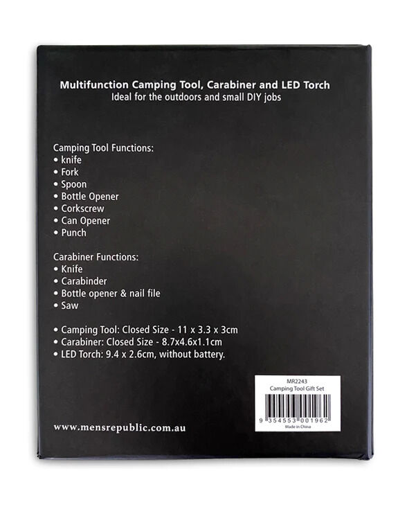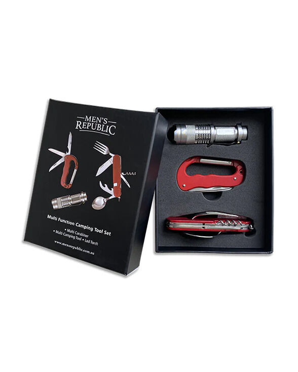 This Men's Republic Camping Tool Set is a must for every camper. Ideal for the outdoors when venturing into the wilderness, or just your father-son backyard overnight.